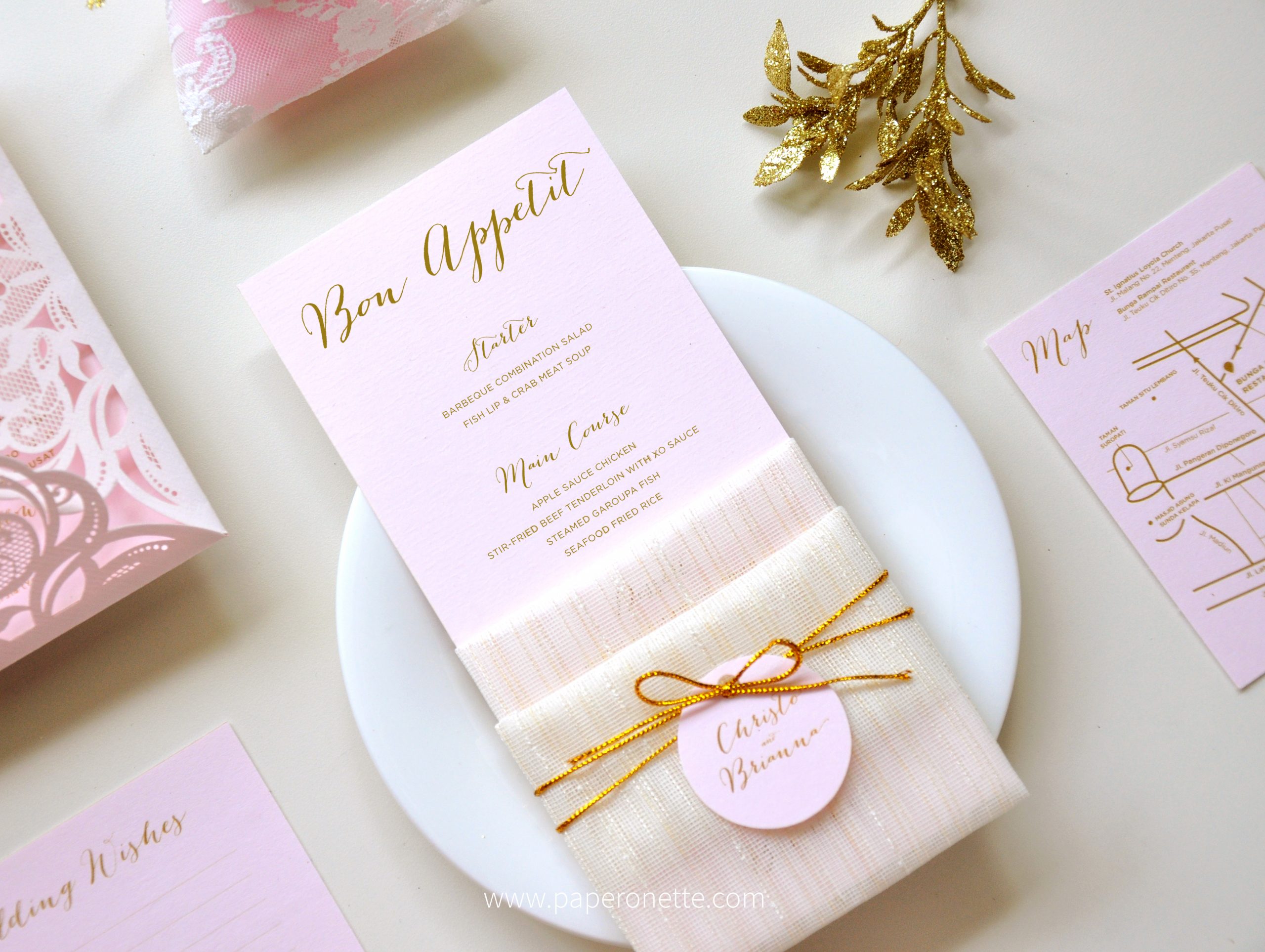 - Set Items: Invitation, Laser cut pocket, Envelope, Souvenir tag, Wishing card, Direction Card, Menu Card.